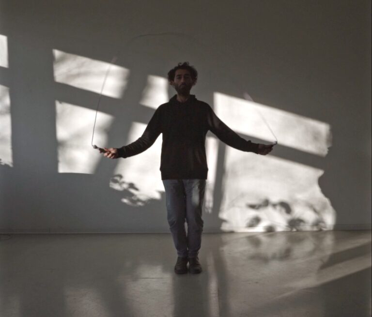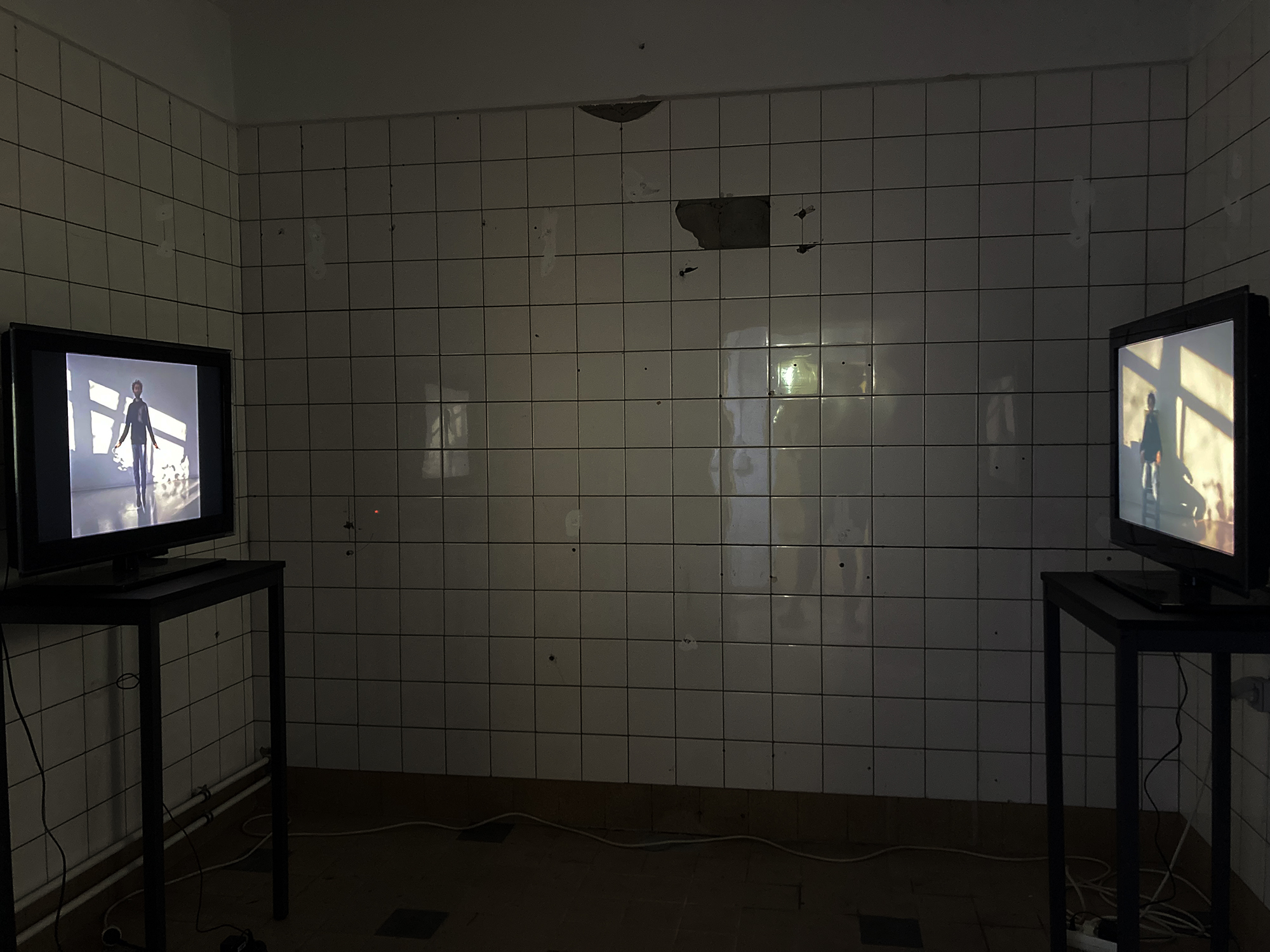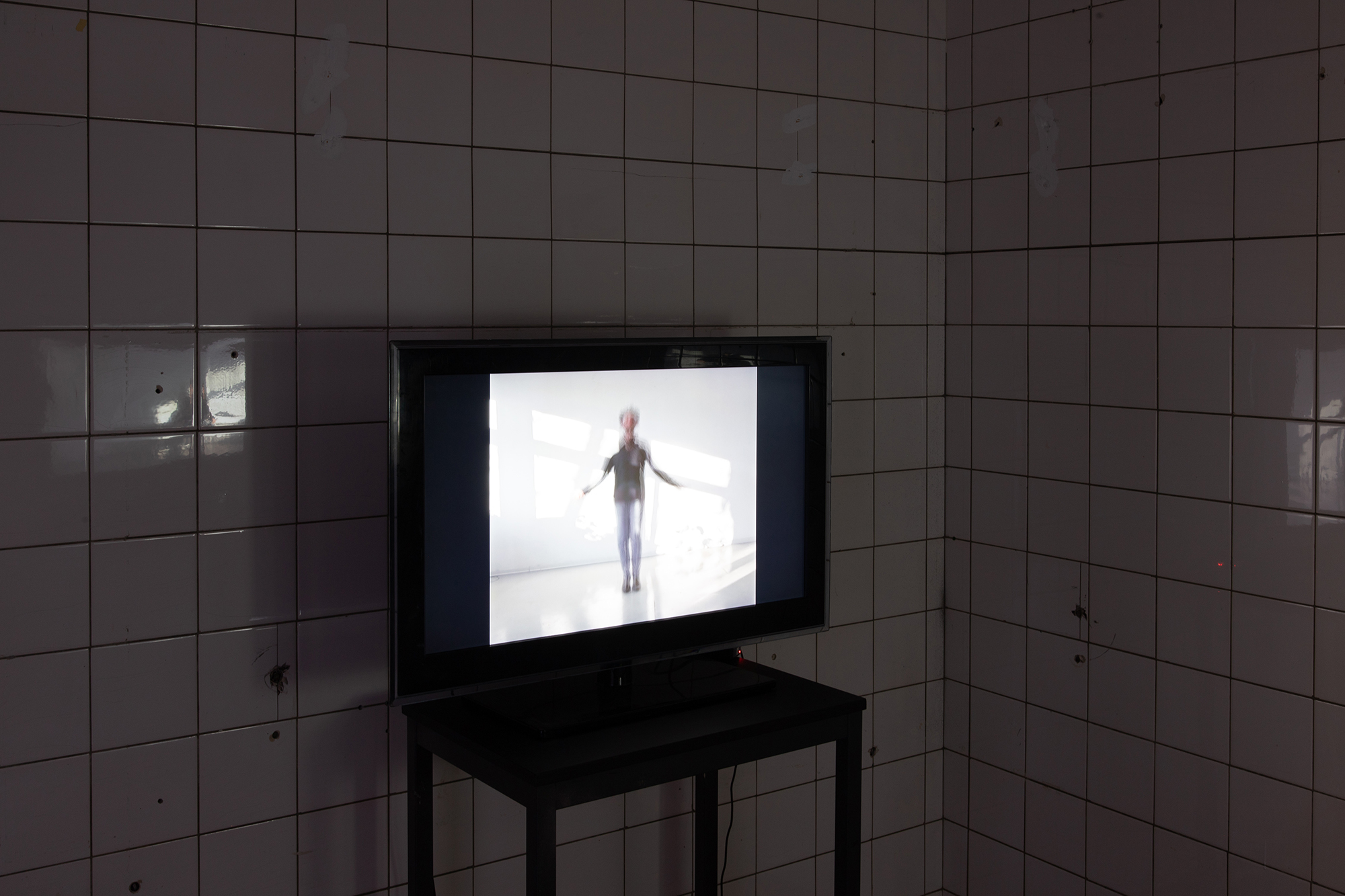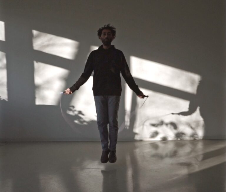 A dual-screen video installation exploring the tension between presence and absence through temporal manipulation. The first video shows the artist sitting still in meditation while fast-forwarded so the shadows are vibrating fast on clean white wall. The second video depicts rope jumping in slow, glitchy reconstituted motion, while the artist’s shadow remains nealy stationary.